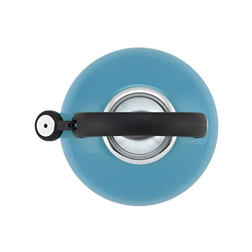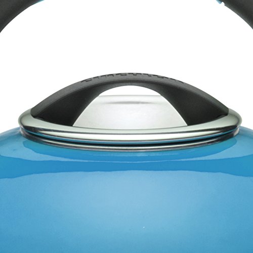 The teakettle's bright enamel exterior resists stains and cleans easily; whistle pleasantly signals when water boils