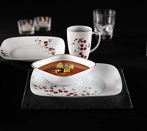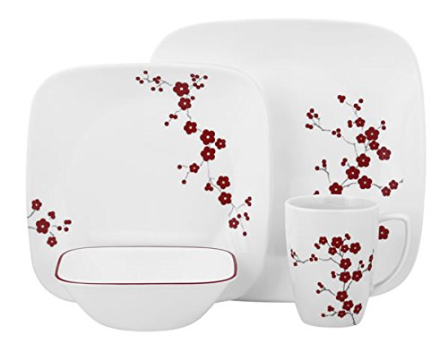 Corelle Square dinnerware features sleek, squared shapes with rounded corners and flared rims which fuse seamlessly with the traditional rounded centers. The result is a totally fresh, yet timeless look-versatile enough for every day dining as well as for entertaining. We are so confident that your Corelle Square dinnerware won't let you down that we backed it with a 3 year limited break and chip resistant warranty.Hanami Garden 16-pc Set includes 4 each: 10-1/4" Dinner Plates, 8-3/4" Luncheon Plates, 22-oz Soup / Cereal Bowls and 12-oz Porcelain Mugs