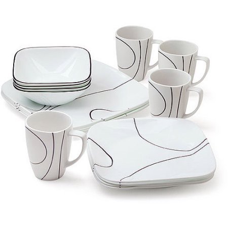 The Corelle Squares Simple Lines 16-piece dinnerware set features sleek, squared shapes with rounded corners and flared rims that fuse seamlessly with the traditional rounded centers. The result is a fresh, timeless look, versatile for everyday dining and special occasions. This square-shaped dinnerware includes four dinner plates, four salad plates, four soup bowls and four mugs. The regular design of this dinnerware makes stacking easy. This microwave-safe porcelain dinnerware set can be easily cleaned in a dishwasher. Sleek brush strokes and designs artistically strewn across pure white backgrounds make it an elegant addition to your dinner table. Be able to provide all of your guests with a porcelain dinnerware set that has everything that they need to dine at your home. Use everything provided to serve tasty meals to friends and family for years to come.16-pieces; service for four