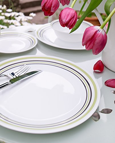Corelle Garden Sketch Bands 12pc Dinner Set Corelle glass dinnerware is designed to make an impact and take one. The patterns are inspired by the latest trends in fashion and home decor, delivering a variety of styles that will make a statement in any household. Every piece of Corelle glass dinnerware is break- and chip-resistant, making it perfect for everyday dining and entertaining proving once again that beauty can be tough. Everybody has their own sense of style, which is why Corelle dinnerware is offered in so many different patterns and shapes. But one thing everybody agrees on is durability. Dinnerware needs to last. Corelle plates and bowls are made from a unique material called Vitrelle, which gives them that legendary Corelle durability. It also gives them a number of other benefits that other brands can't offer. Chip Resistant Break Resistant Tempered Glass Stain Resistant Scratch Resistant Microwave, Oven and Dishwasher Safe Lightweight Compact & Stackable Patterns are Fade Resistant 3 Year Limited Warranty Corelle Livingware dinnerware is created using a hub lamination process that fuses multiple layers of glass together to create a lightweight, yet durable glassware that is break and chip resistant. The result is a beautiful round dinnerware set that is as stylish as it is functional. We stand behind our dinnerware with a 3 year break and chip limited warranty. The ergonomic design makes it easy to handle. It also allows the dishes to stack neatly to conserve space. Corelle Livingware dinnerware setsare designed to fit the way you live. Functional, stylish and always ready for a dinner party, Corelle Livingware dishes epitomize the definition of versatility. They are the all-in-one dinnerware pieces that can go from family supper to formal dinner party - without having to change first! So whether you're heating up leftovers or are making a risotto from scratch, everything looks great on a set of Corelle Livingware dishesService for 4 includes: 4 each 10-1/4" Dinner Plates, 8-1/2" Luncheon/Salad Plates, 18-Ounce Soup/Cereal Bowls