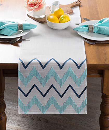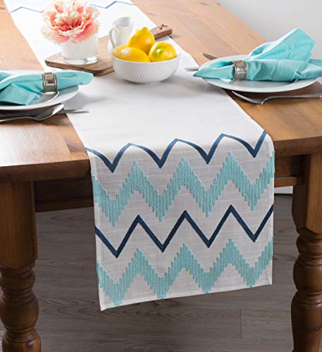 DII has a wonderful selection of table runners available. Our 100% polyester table runner with a beautiful embroidered design will add flair to your summer parties or family gatherings. The 14x70" size is long enough for most surfaces. Work great as an overlay for a solid color tablecloth or on its own. They’ll look just as great on long rectangular dining tables as a smaller bistro table or coffee table. DII offers delightful home products including napkin rings, placemats and home decor. Click the DII link at the top of the page to explore our collections or search "DII Tabletop".FOR YOUR TABLE - Our 100% polyester table runner measures 14x70". Fits tables that seat 4-8 people.