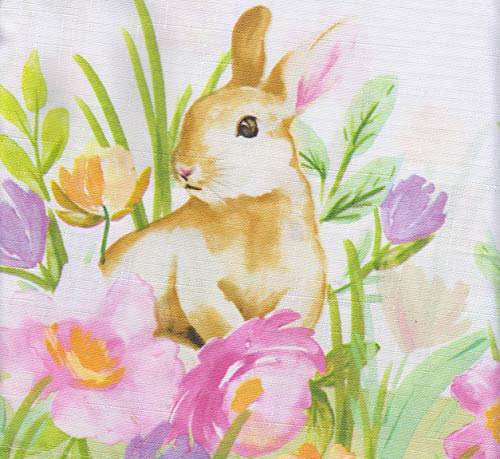 This fabric tablecloth is perfect for your Easter decorating and entertaining. The white background is decorated with bunnies, spring flowers, and butterflies. The pattern is Easter Bunnies Playing. 100% textured polyester. The fabric is machine washable and can be tumbled on low heat. This multi-color print tablecloth can be used with solid color placemats, a runner and napkins for a stunning effect. Size is 60 x 84 Rectangle/Oblong - Seating for 6 to 8. Fits table 36 x 60 to 48 x 72 inches.Beautiful Easter fabric tablecloth featuring bunnies playing in spring flowers with butterflies