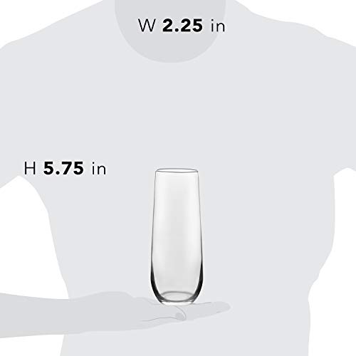 Perfect for casual dining and entertaining, Libbey's set of 12 stemless champagne flute glasses feature a sophisticated, upscale curved design that's ideal for all your bubbly beverages. Durable and chip resistant, this crystal clear stemless drinkware is stable, ergonomic, and balanced for less tipping and more sipping. This set includes twelve 8.5-ounce flute glasses.