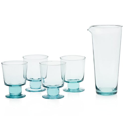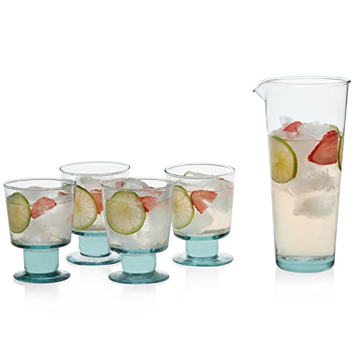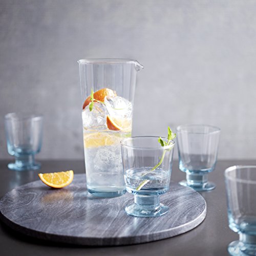 Handblown by artisans from recycled material with a sophisticated sea-blue hue, this Prologue Luna Entertaining Set from Libbey imparts an elegant touch to dinner parties, patio cocktails, and everyday casual dining. This set includes four 10-ounce double old-fashioned stemmed rocks glasses and a 33-ounce glass carafe.